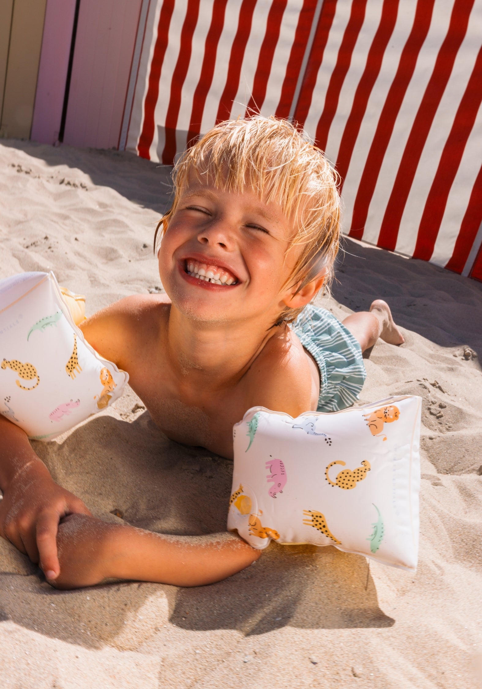 El Chaleco con manguitos tiene una doble hebilla en la espalda, pensada justo para que el chaleco no se mueva ni se salga. Así se queda bien ajustado mientras nadan y tu peque no se lo puede quitar solo.
